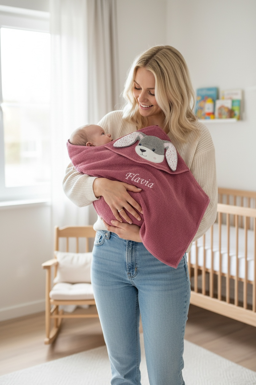 Ein weiteres besonderes Merkmal ist die Möglichkeit zur Personalisierung: Sie können das Badetuch mit dem Namen Ihres Kindes besticken lassen und dabei aus verschiedenen Schriftarten und Schriftfarben wählen. Dies macht das Kapuzenbadetuch zu einem einzigartigen und persönlichen Geschenk zur Geburt, Taufe oder zum Geburtstag.