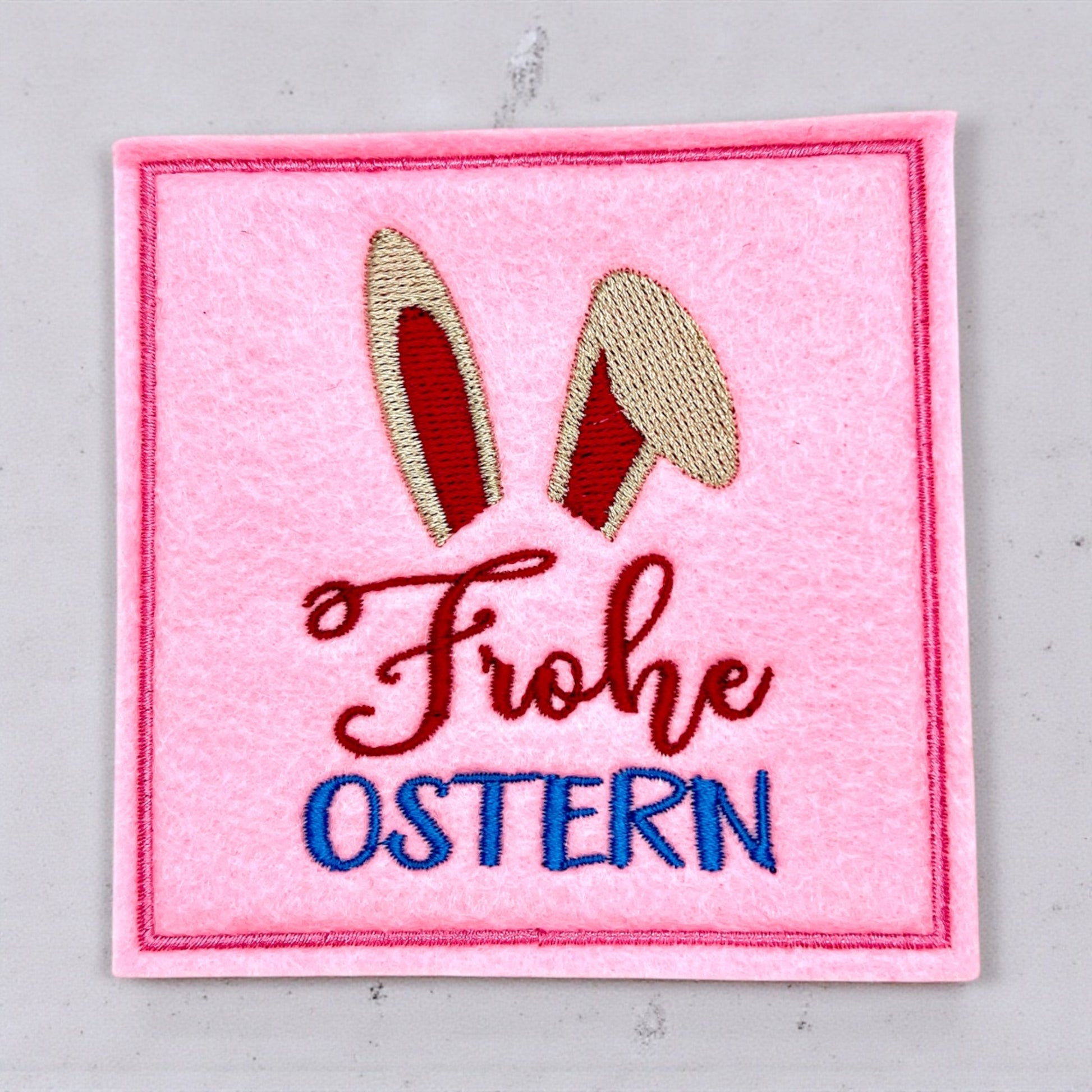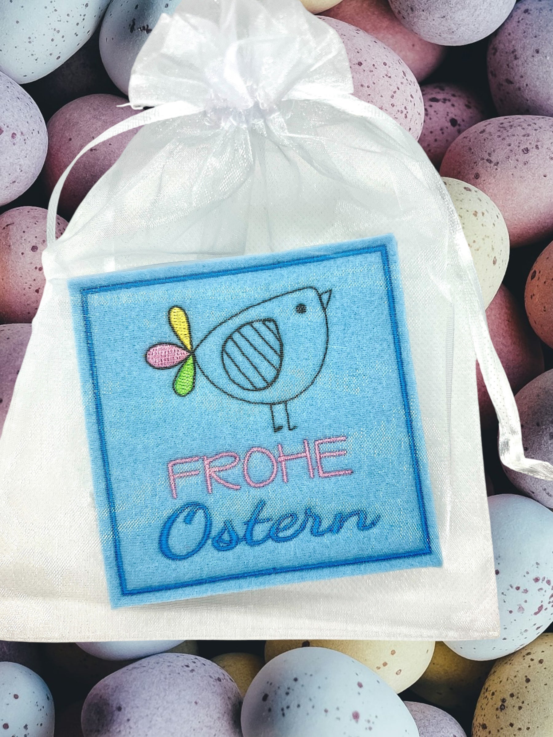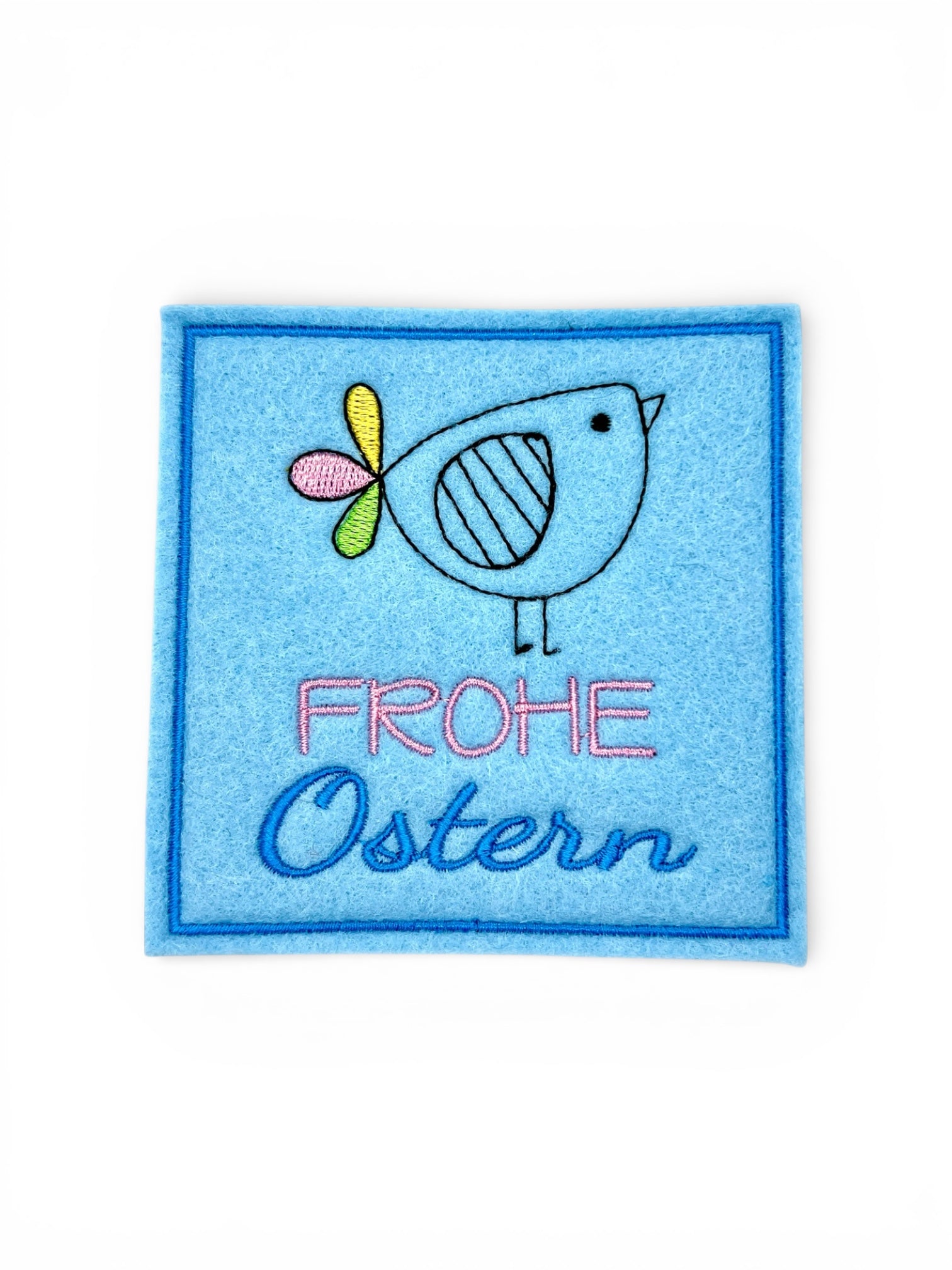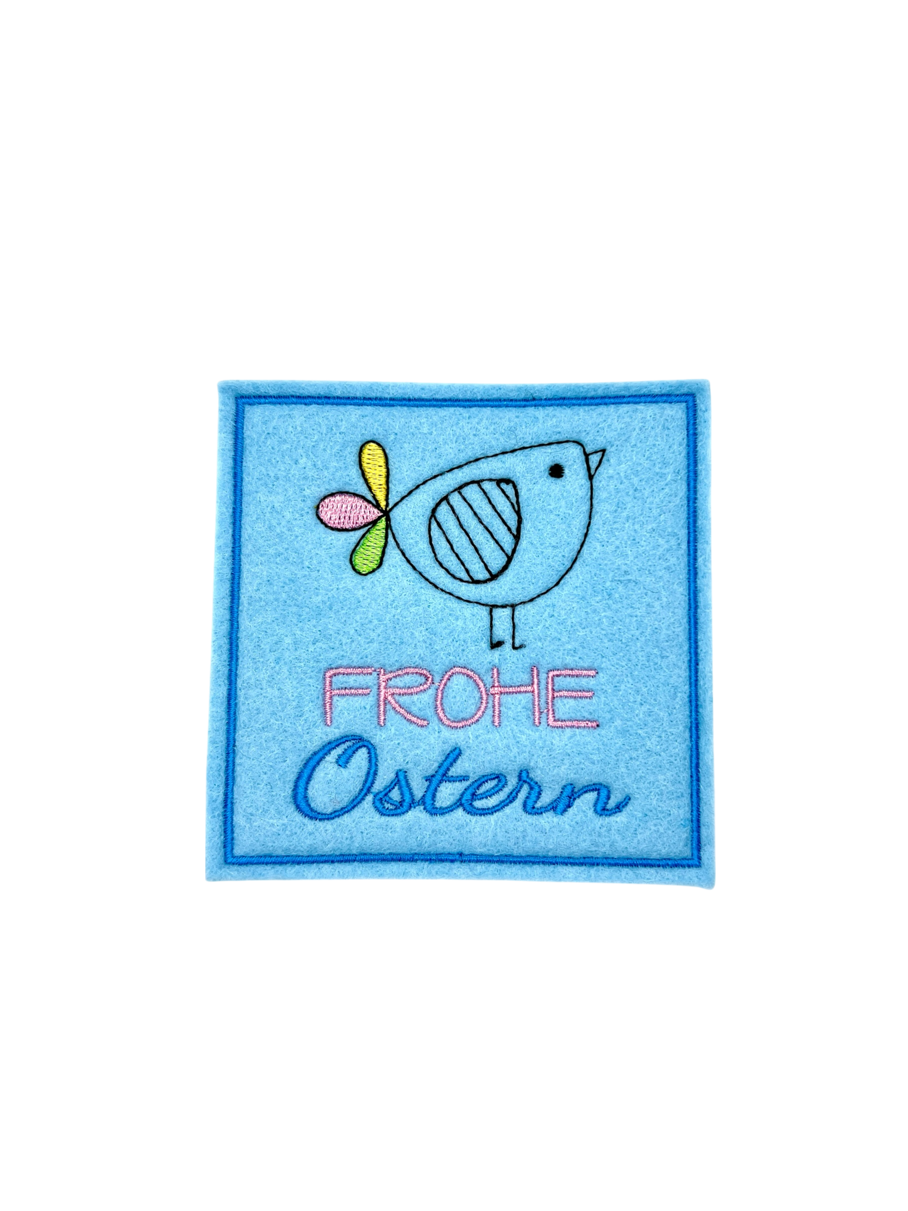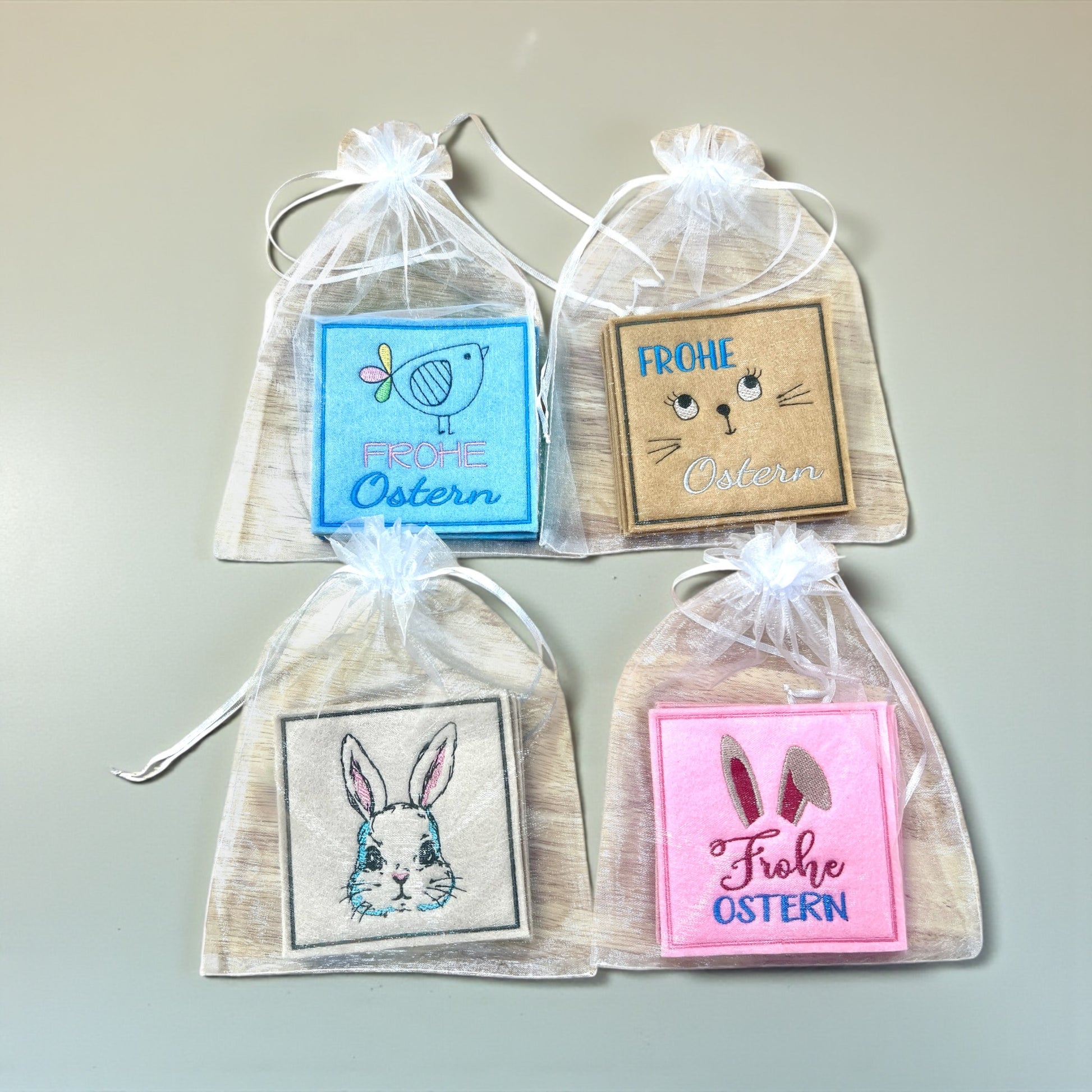4 Glasuntersetzer aus 2 Lagen Filz, bestickt mit Ostermotiv