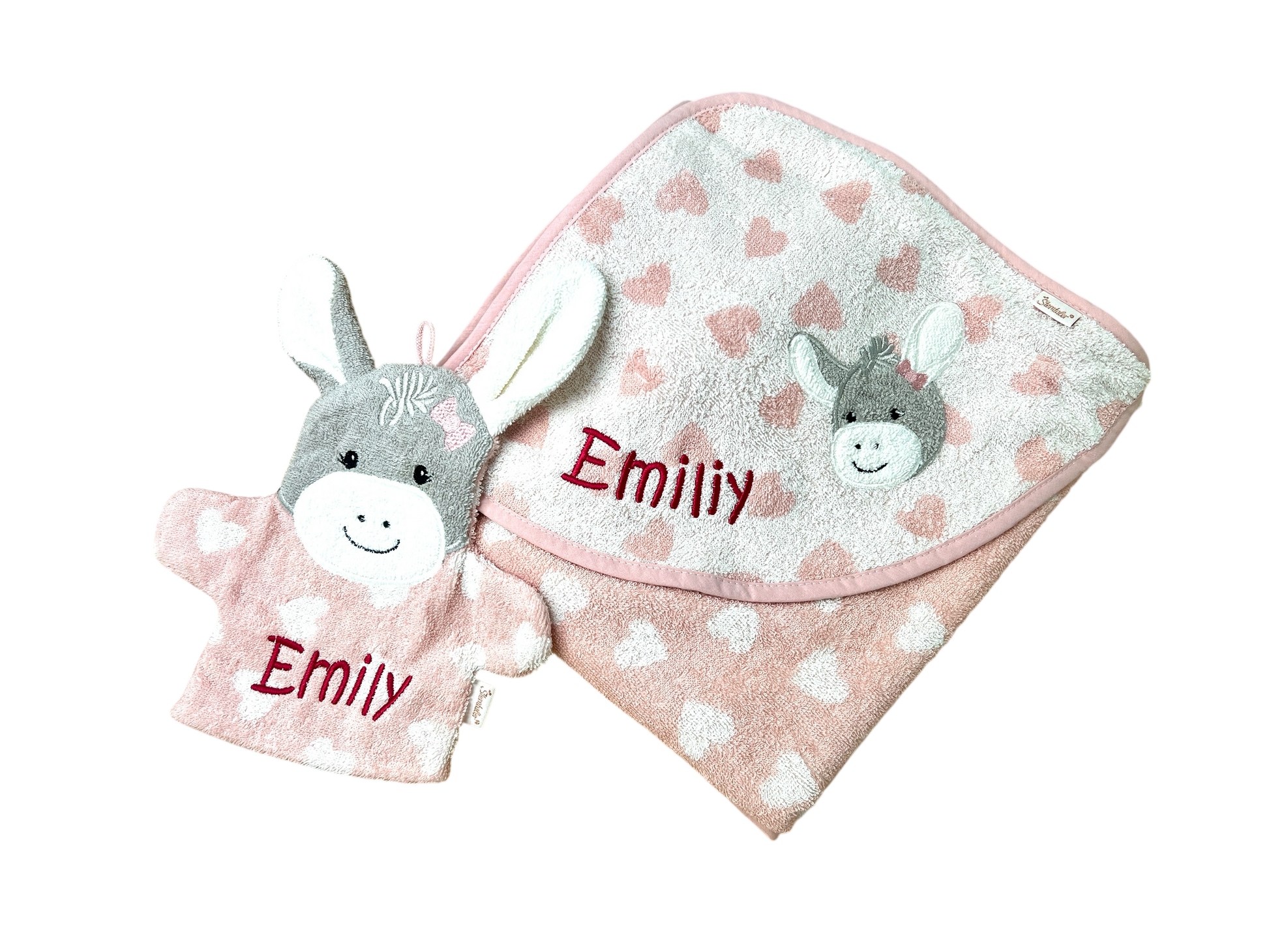 Set aus Kapuzenhandtuch und Spiel-Waschhandschuh in rosa mit süßem Esel-Motiv und Name bestickt - Baby Badeset Esel Emmi Girl