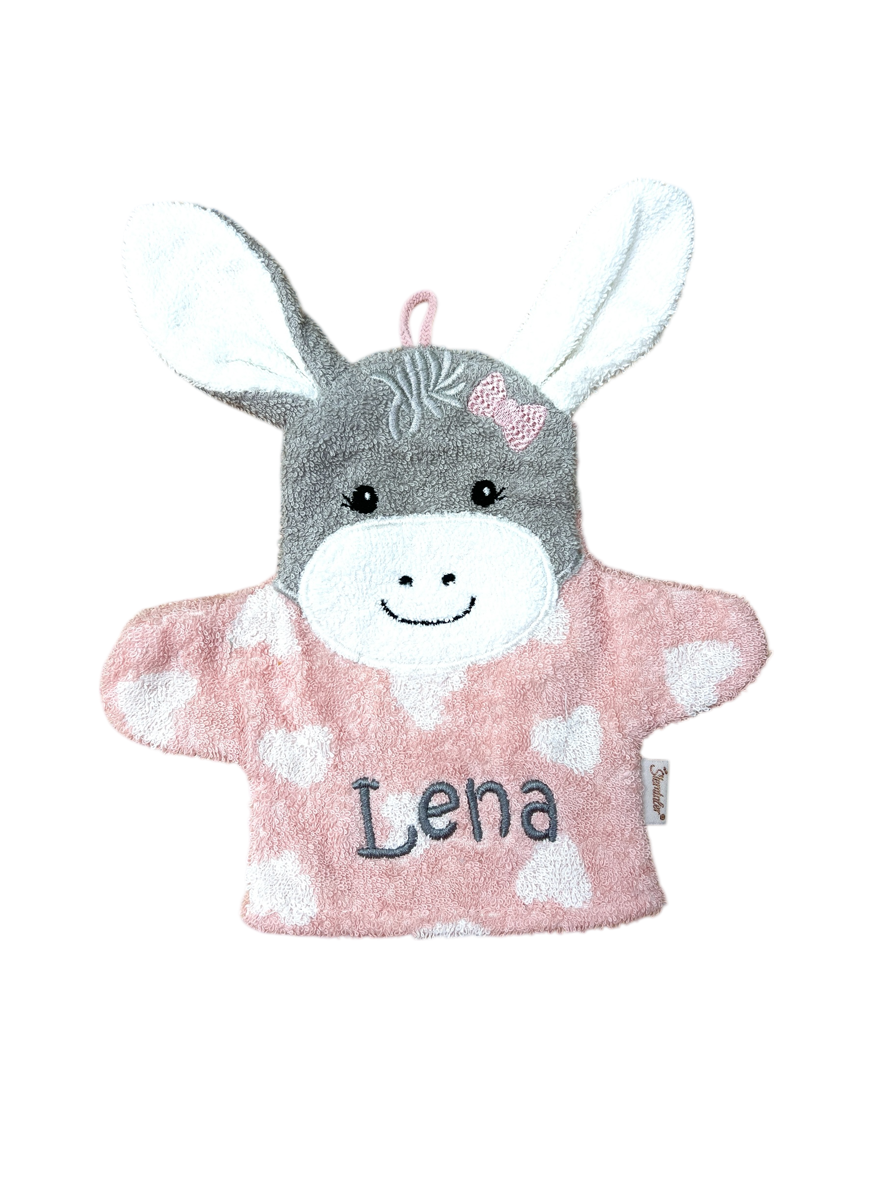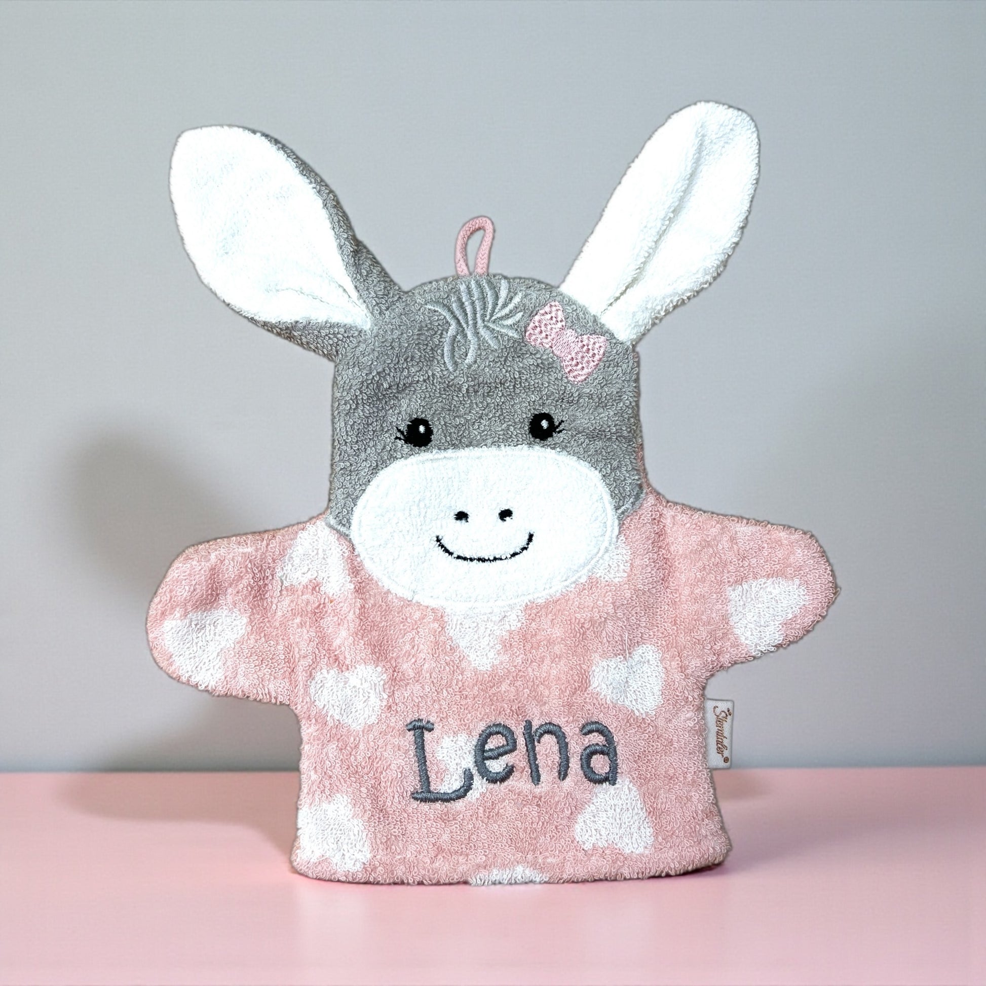Ein Spiel-Waschhandschuh Esel Emmi Girl mit gewünschter Personalisierung